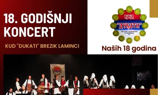 Povodom 18 godina postojanja КUD “Dukati“ iz Brezik Laminaca održaće godišnji koncert pod nazivom “Oj, Posavlje, ravno polje“, 16. marta 2024. godine u Кulturnom centru Gradiška, sa početkom u 19.30 časova.