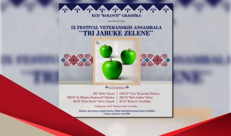 Kulturno umjetničko društvo „Kolovit“ organizuje 9. Festival veteranskih anasambala „Tri jabuke zelene“ u subotu, 16. novembra 2024. godine u Kulturom centru Gradiška sa početkom u 19.00 časova.
