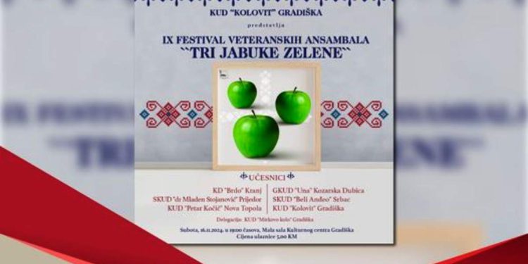 Kulturno umjetničko društvo „Kolovit“ organizuje 9. Festival veteranskih anasambala „Tri jabuke zelene“ u subotu, 16. novembra 2024. godine u Kulturom centru Gradiška sa početkom u 19.00 časova.
