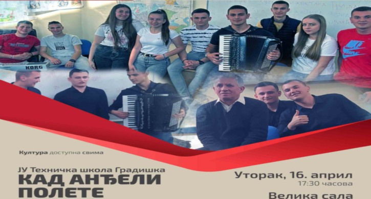 JU Tehnička škola Gradiška organizuje humanitarnu priredbu pod nazivom “Kad anđeli polete“ u utorak, 16. aprila od 17:30 časova u velikoj sali Kulturnog centra Gradiška.