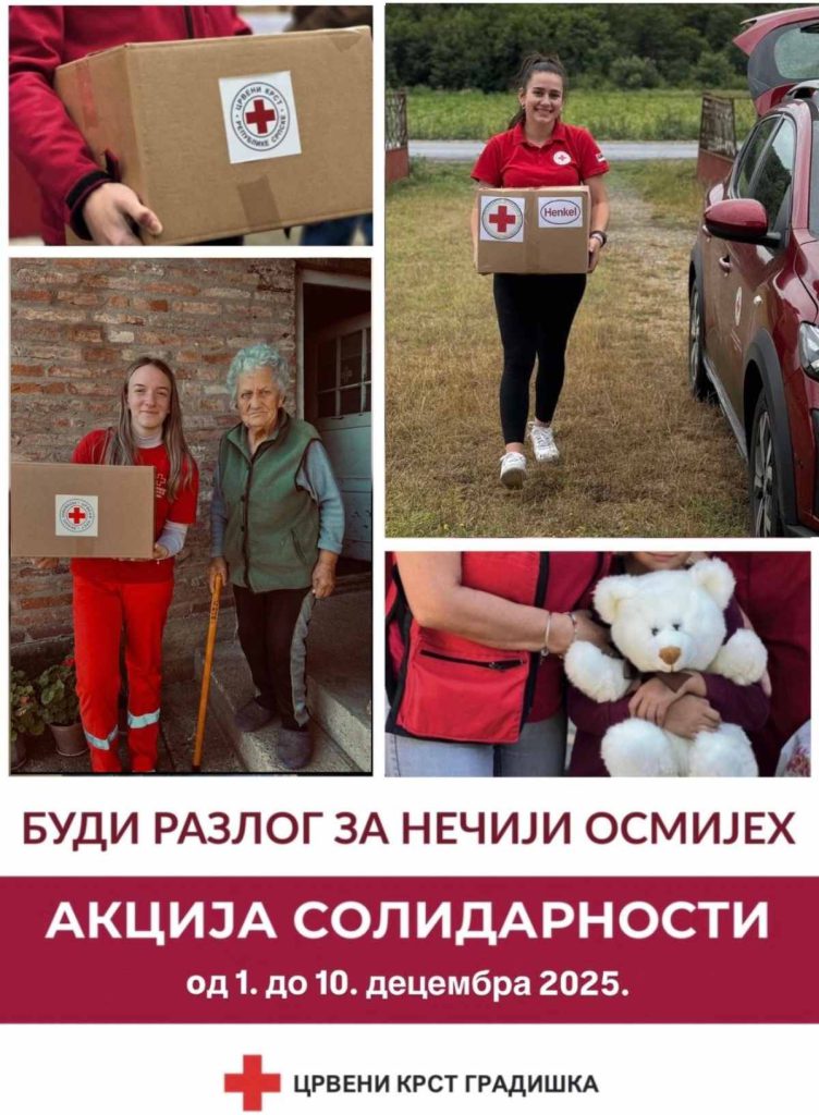 Gradska organizacija Crvenog krsta Gradiška i ove godine organizuje tradicionalnu humanitarnu “Akciju solidarnosti“, koja će trajati od 1. do 10. decembra čiji je cilj pružanje podrške socijalno ugroženim porodicama i pojedincima uoči novogodišnjih i božićnih praznika.