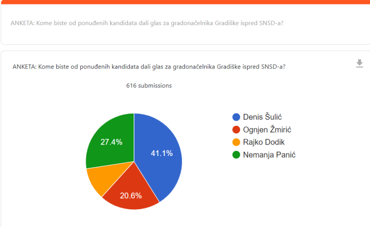 U trećem presjeku stanja gdje smo pitali građane “Kome biste od ponuđenih kandidata dali glas za gradonačelnika Gradiške ispred SNSD-a?”, za sada nema nikakvih promjena, s tim da je sve gušće na drugoj poziciji.