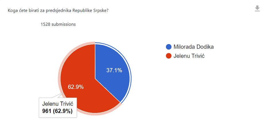 Prethodnih sedam dana ”Micro mreža” je napravila anketu u kojoj ste mogli birati predsjednika Republike Srpske, od dva ponuđena kandidata, Jelene Trivić i Milorada Dodika.