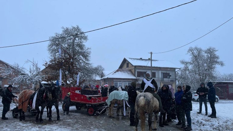 Na putu ka hramu Vaznesenja Gospodnjeg u Elezagiće, zatekli smo badnjačarsku kolonu Mjesne zajednice Rogolji koja je očuvala stari način voženja Badnjaka, konjskim zapregama.