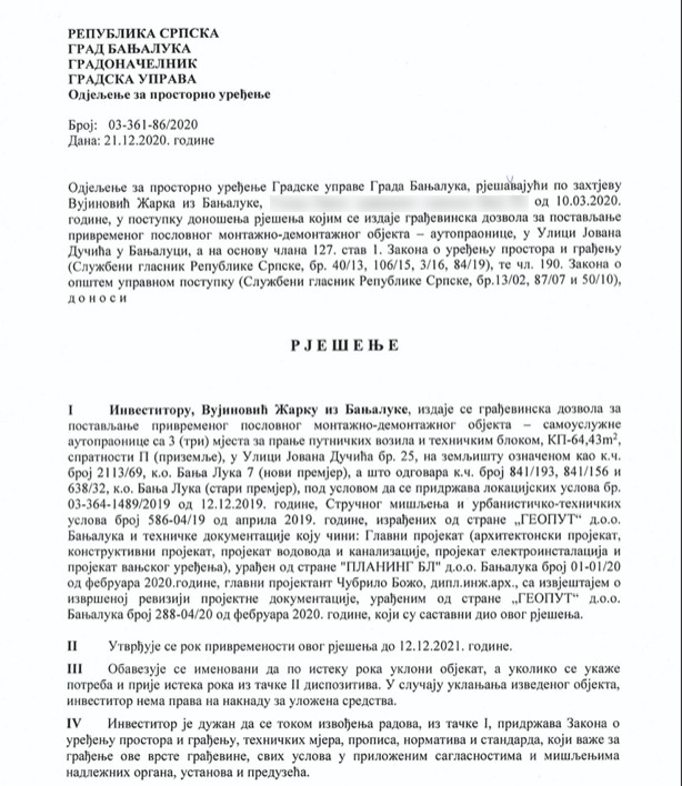Pobjedom Draška Stanivukovića na lokalnim izborima, slučaj se ubrzava, kako nova vlast ne bi poremetila planove. Odjeljenje za prostorno uređenje Grada Banjaluka, tako je Vujinoviću dozvolu za gradnju izdalo 21. decembra prošle godine, samo tri dana prije nego je Stanivuković preuzeo gradonačelničku fotelju od Radojičića. Međutim, spomenuta dozvola podrazumijeva autopraonicu sa tri boksa, ali vlasnici su, protivno zakonu, nastavili da rade sa svih šest boksova. Samim tim, jasno je da autopraonica i dalje ne ispunjava ekološke uslove, niti uslove fizičke odvojenosti od drugih objekata. Rješenje o izdavanju građevinske dozvole je privremeno i važi do 21. decembra 2021. godine.