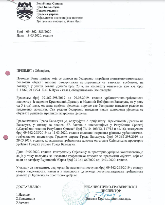 Nakon prijave građana Gradskoj upravi Banjaluka, urbanističko-građevinska inspektorica Biljana Kragulj obišla je autopraonicu krajem marta 2019. godine, ustanovila nepravilnosti i naredila Maliniću i Kremenoviću da u roku od tri dana poruše sve bespravno izvedene radove na ovoj lokaciji. Tri mjeseca kasnije, Kragulj je zabranila korištenje i upotrebu samouslužne autopraonice koju su njeni vlasnici sve vrijeme koristili bez pribavljenog rješenja o upotrebi.