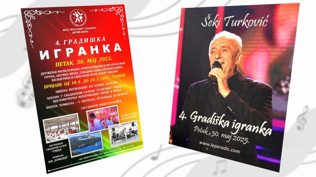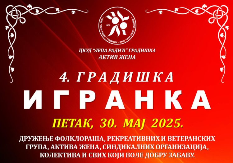 Gradiška igranka će se po 4. put održati u petak – 30. maja, a u organizaciji Aktiva žena Centralnog KUD-a “Lepa Radić”. Druženje i dobro raspoloženje su sinonim za ovu zabavu koja će se održati u Svadbenom salonu “Tina” u Gradišci.