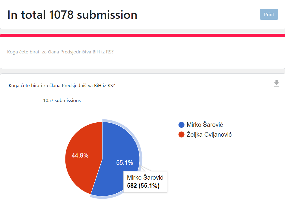U ponuđenoj anketi čitaoci su birali između Željke Cvijanović, koja je kandidat vladajuće koalicije i Mirka Šarovića, koji je kandidat opozicije.