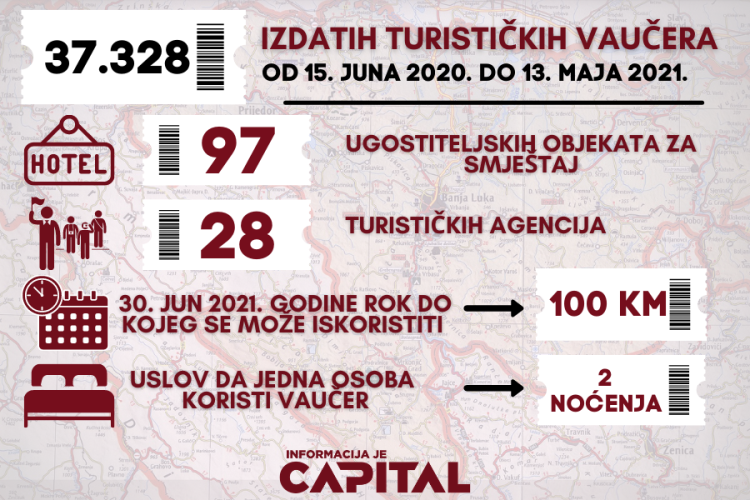 Vaučer od 100 maraka se do 30. juna može iskoristiti za plaćanje smještaja u hotelima uz uslov da se u njima prenoći minimalno dvije noći, ili tri ako su u pitanju dva korisnika.