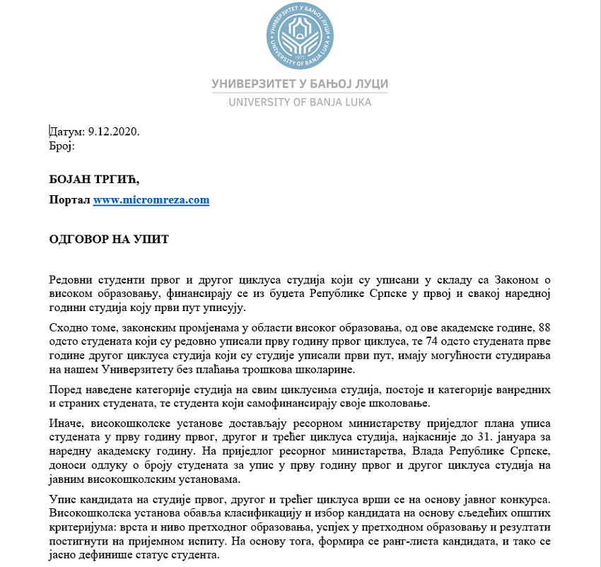 Odgovore na pitanja šta je sa opcijom sufinansiranje prilikom upisa na master potražili smo direktno od rukovodstva Univerziteta u Banjoj Luci, koji nisu dali ni blizu precizan odgovor na pitanje koje smo im uputili.