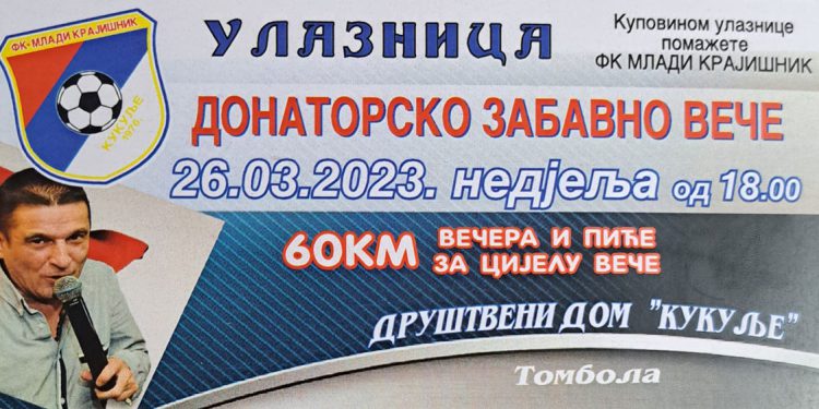 Kupovinom ulaznice koja košta 60 KM (u cijenu je uračunata konzumacija hrane i pića tokom cijele večeri) pomažete funkcionisanju Fudbalskog kluba “Mladi Krajišnik”, koji se takmiči u Područnoj ligi Gradiška.
