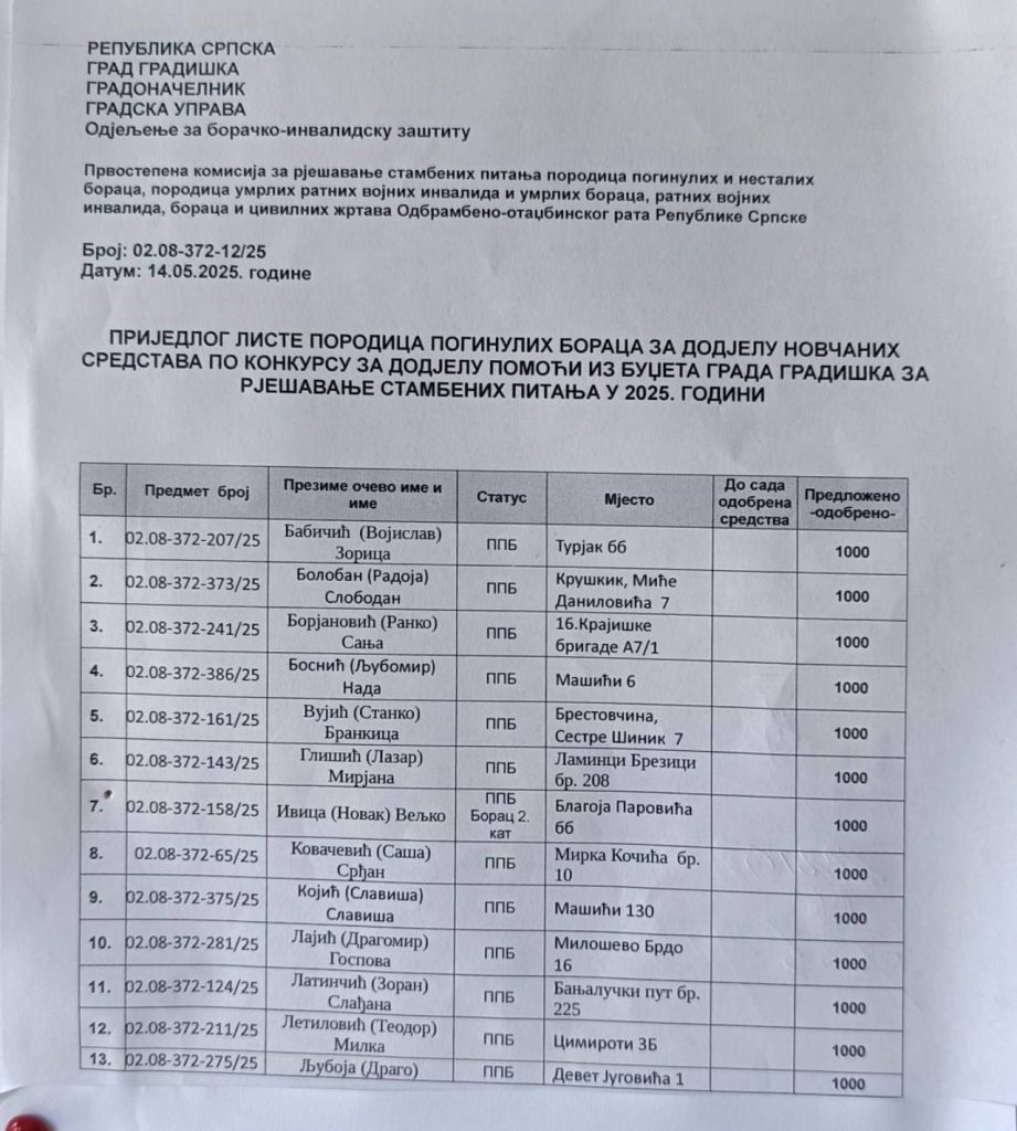 “U vrijeme kada je gradonačelnik bio Nikola Kragulj, sredstva za stambeno zbrinjavanje bila su preko 200 hiljada KM, kada su boračke kategorije dobijale i po dvije tri hiljade KM, a u mandatu Zorana Latinovića fond je umanjen na oko 130 hiljada KM, čime su pojedinačna izdvajanja ograničena i time onemogućeno kvalitetno rješavanje problema porodica poginulih, ratnih vojnih invalida, boraca i civilnih žrtava rata. Od naredne godine imamo obećanje da će sredstva za ove namjene biti veća jer je činjenica da je sve poskupjelo i da su ozbiljna sredstva potrebna kako bi se na stambenim objektima moglo nešto kvalitetno uraditi”, pojasnio je Gagić.
