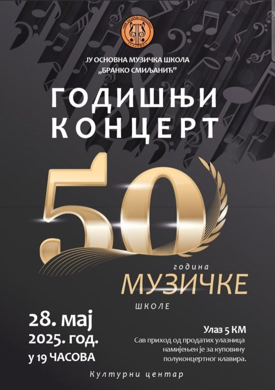 Drugi godišnji koncert učenika Osnovne muzičke škole “Branko Smiljanić“ biće održan u srijedu, 28. maja od 19.00 časova u Koncertnoj sali Kulturnog centra.