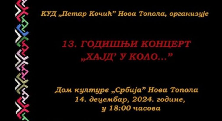 KUD “Petar Kočić” iz Nove Topole održaće 13.godišnji koncert pod nazivom “Hajd` u kolo” u Domu kulture “Srbija“ u Novoj Topoli u subotu, 14. decembra sa početkom od 18 časova.