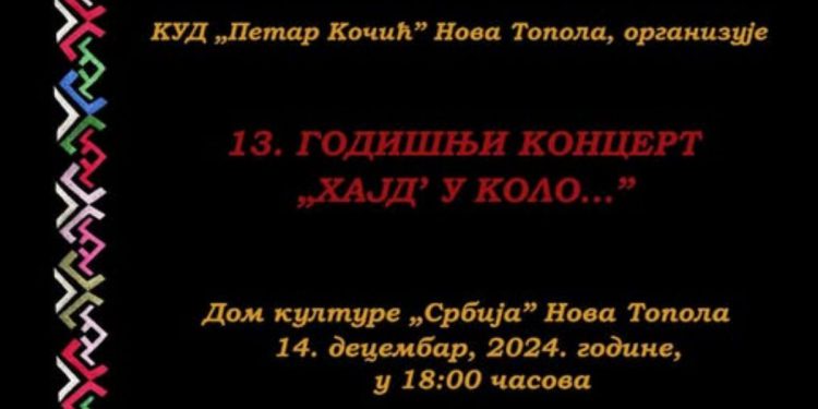 KUD “Petar Kočić” iz Nove Topole održaće 13.godišnji koncert pod nazivom “Hajd` u kolo” u Domu kulture “Srbija“ u Novoj Topoli u subotu, 14. decembra sa početkom od 18 časova.