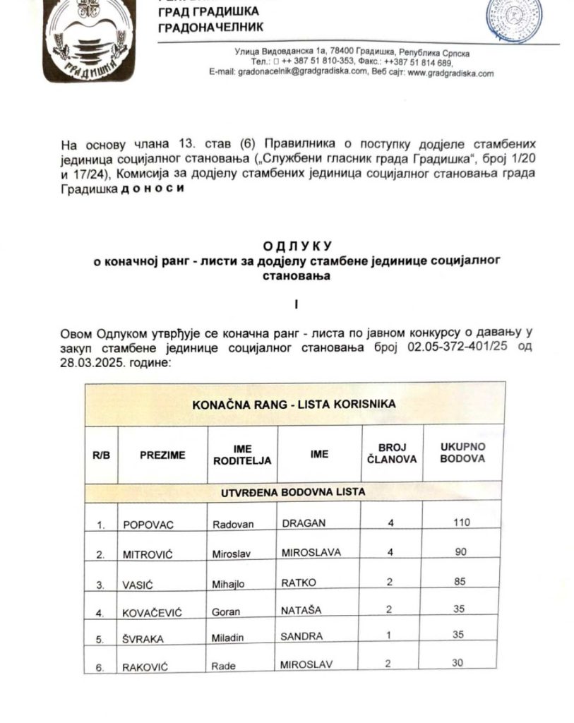 Na osnovu Javnog konkursa o davanju u zakup stambene jedinice socijalnog stanovanja, grad Gradiška je dana 23.07.2025. godine na Oglasnoj tabli Gradske uprave objavio konačnu rang – listu za dodjelu stambenih jedinica socijalnog stanovanja.