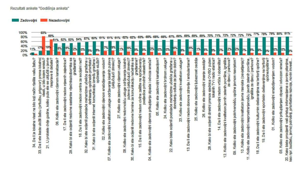 Najviše nezadovoljnih je cijenom kanalizacije, kao i radom mjesnih zajednica. Veliki broj njih ističe i da nisu upoznati sa sastancima odbornika koji se održavaju sa građanima, što ukazuje na lošu komunikaciju i slabu uključenost u lokalno odlučivanje o čemu govori procenat od 83 odsto ispitanika koji nikada nisu uložili žalbu ili pritužbu u bilo kojem obliku prema lokalnoj vlasti.