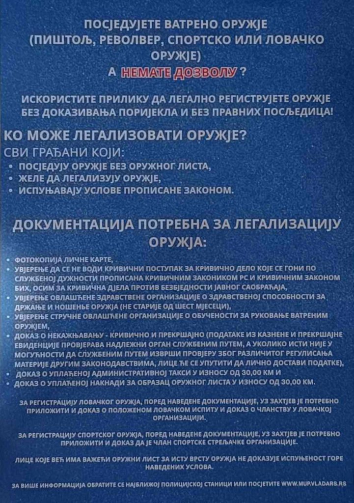 “Policijski službenici danas dijele letke koji sadrže infrmacije o proceduri i zakonskim mogućnostima registracije oružja dozvoljenog za držanje, a bez sankcija uz prilaganje odgovarajuće dokumentacije”, navela je portparol PU Gradiška, Dunja Blagojević.