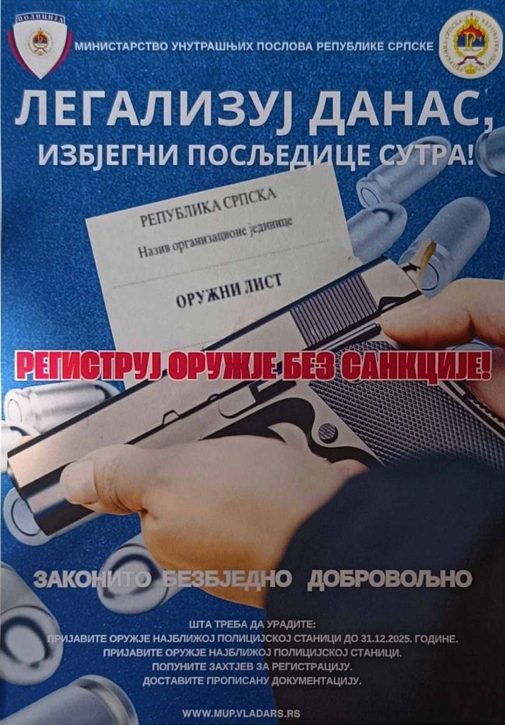 Kako je saopšteno iz PU Gradiška, kampanja traje do kraja godine, odnosno 31.12.2025. godine, a građani oružje mogu legalizovati podnošenjem dokumentacije u najbližoj policijskoj stanici.