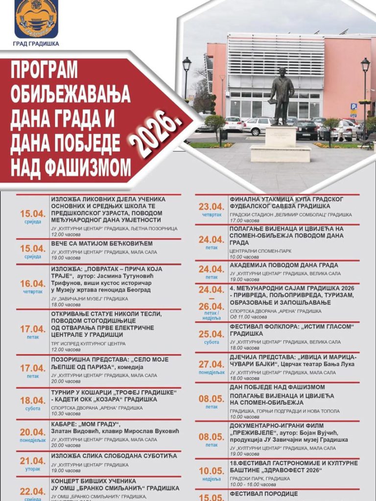 Poseban značaj imaće 24. april, kada će biti organizovano polaganje vijenaca u Centralnom spomen-parku, kao i svečana akademija povodom Dana grada. U istom periodu, od 24. do 26. aprila, biće održan i Međunarodni sajam “Gradiška 2026”, posvećen privredi, poljoprivredi, turizmu, obrazovanju i zapošljavanju.