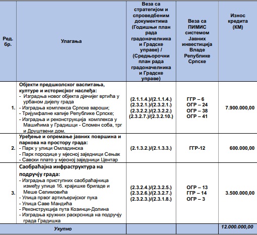Kako je navedeno u Prijedlogu Odluke o kreditnom zaduženju koje će grad otplaćivati narednih deset godina, uz kamatnu stopu do 5,5 odsto, namijenjen je finansiranju kapitalnih investicija u 2026. i 2027. godini, a kako se navodi najveći dio sredstava biće usmjeren na izgradnju i rekonstrukciju objekata predškolskog vaspitanja, kulture i kulturno-istorijskog nasljeđa, za šta je planirano 7,9 miliona KM.