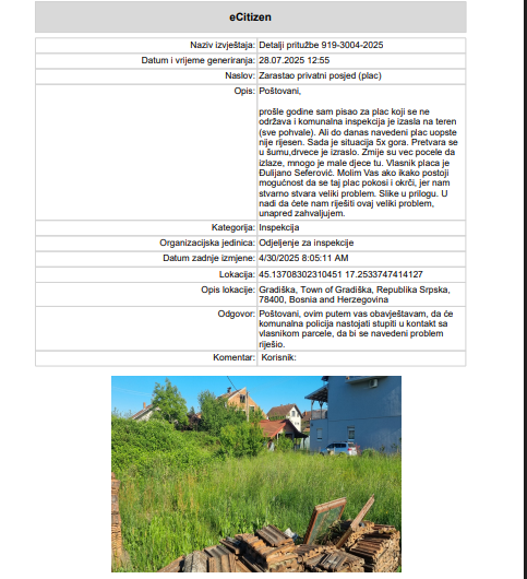 Brojni primjeri apela građana da se urede pojedina zapuštena dvorišta u samom gradu i periferiji zabilježena su i putem aplikacije eCitizen, pa je tako u aprilu mjesecu ove godine Odjeljenju za inspekcije podnesen zahtjev građanina putem eCitizen platforme koji je prijavio zarastao posjed komšije, a iz pomenutog odjeljenja je odgovoreno kako će komunalna policija nastojati kontaktirati vlasnika. Dakle, situacija je rješiva ukoliko se pronađe vlasnik, ali u suprotnom nema zakonskog osnova da se bilo šta preduzme i ovim problemom koji je zasigurno prisutan u mnogim lokalnim zajednicama pozabaviće se u Savezu opština i gradova RS.