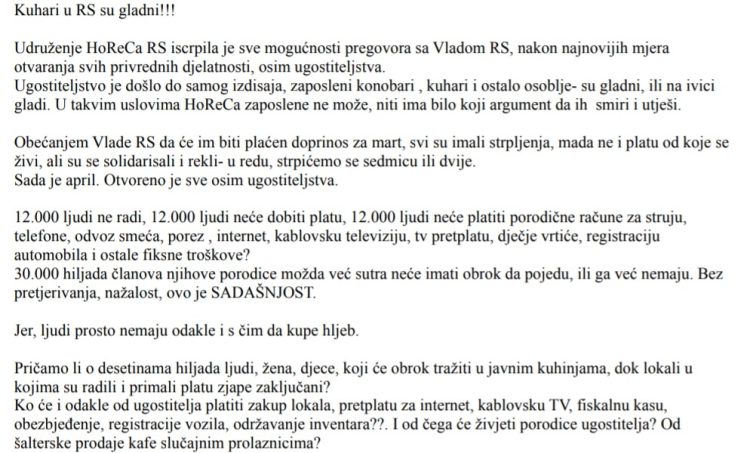 Udruženje ugostitelja “HORECA” saopštava da ovo udruženje neće snositi nikakvu odgovornost za eventualne proteste građana koji rade u ovoj grani privrede a kojima je onemogućen rad i zarada. U ovom udruženj napominju da oni iako su voljni ne vide mogućnost daljih razgovora sa Vladom Republike Srpske.
