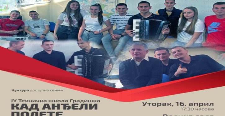 JU Tehnička škola Gradiška organizuje humanitarnu priredbu pod nazivom “Kad anđeli polete“ u utorak, 16. aprila od 17:30 časova u velikoj sali Kulturnog centra Gradiška.