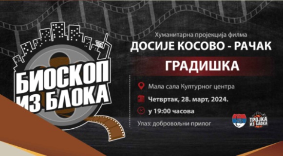 Humanitarna organizacija “Srbi za Srbe“ organizuje projekciju filma „Dosije Kosovo – Račak“ u maloj sali Kulturnog centra Gradiška dana 28.03 – četvrtak sa početkom u 19 časova.