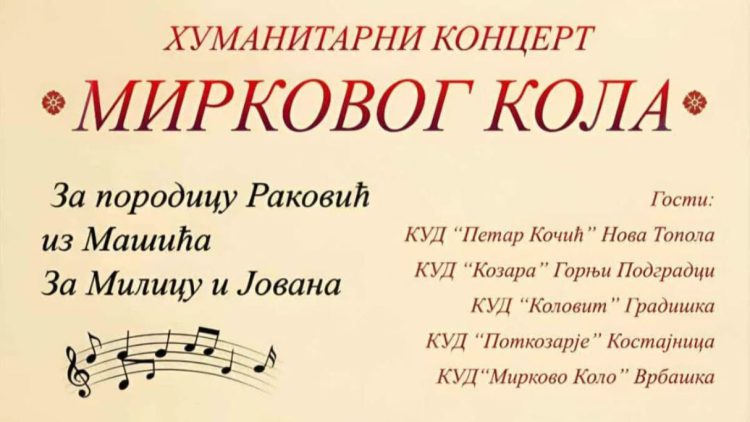 U nedelju 28. septembra 2025 godine od 19.00 časova u velikoj sali Kulturnog centra Gradiška, održaće se humanitarni koncert Mirkovog kola. Koncert se organizuje kako bi se skupilo sredstava za pomoć porodici Raković iz Mašića.