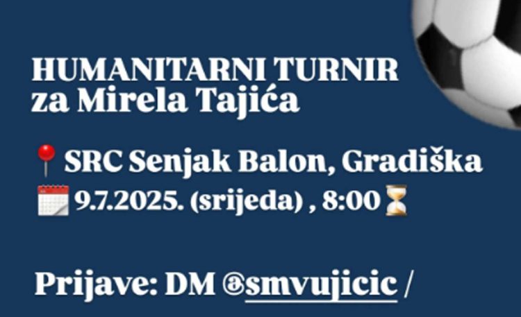 Sportski rekreativni centar Senjak Balon u Gradišci biće domaćin humanitarnog turnira za pomoć Mirelu Tajiću, mladiću koji se nalazi u teškoj životnoj situaciji. Turnir je zakazan za srijedu, 9. jula 2025. godine, sa početkom u 08,00 časova.