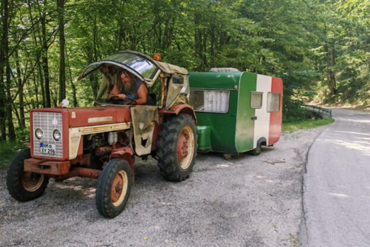 Neobična priča danas je izmamila osmijehe ali i radoznalost mještanima Kozarca kod Prijedora. U glavnoj ulici ovog potkozarskog mjesta, pažnju je privukla nesvakidašnja scena: stari traktor sa, ni manje ni više, njemačkim tablicama, koji vuče starinsku kamp-prikolicu u bojama italijanske zastave.