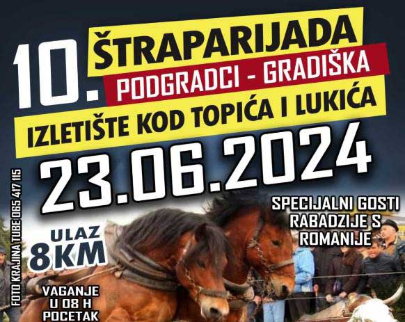 Izložba konja i 10. Međunarodna štraparijada u Podgradcima kod Gradiške, biće održana 23.06.2024. godine na izletištu kod Topića i Lukića uz bogat fond nagrada za takmičare u nekoliko kategorija.