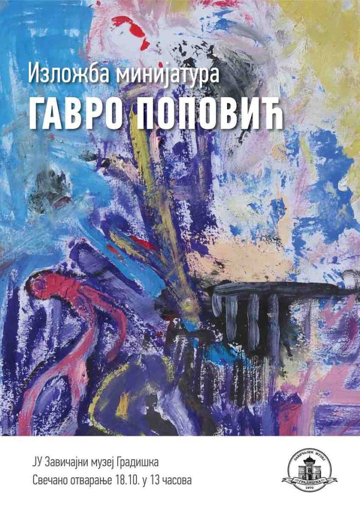U galerijskom prostoru Zavičajnog muzeja Gradiška u utorak 18. oktobra 2022. godine u 13 časova biće otvorena izložba minijatura Gavre Popovića.