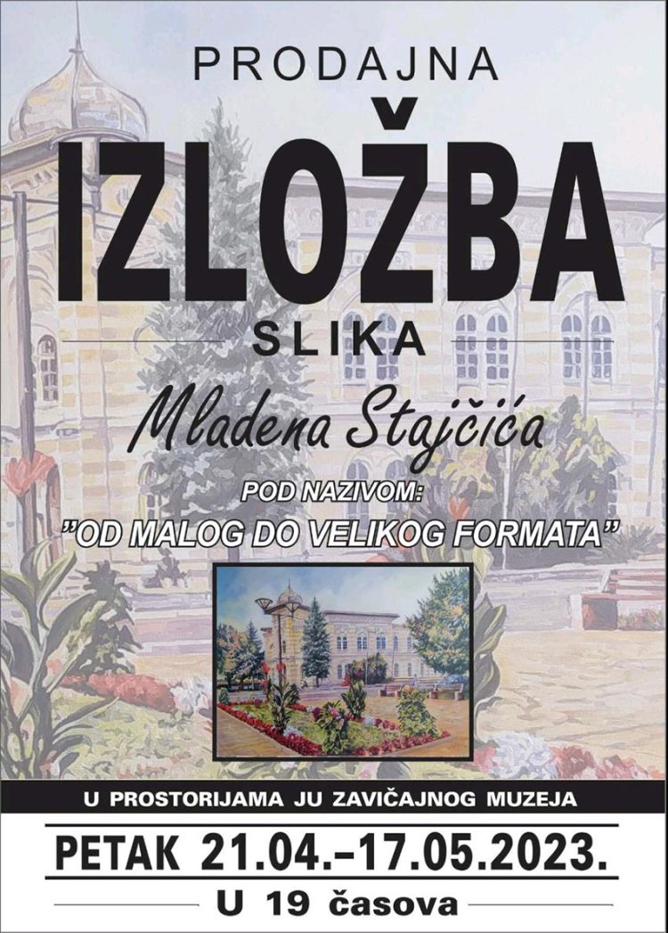 Izložba slika pod nazivom “Od malog do velikog formata”, autora Mladena Stajčića iz Gradiške, biće otvorena u petak, 21. aprila 2023. godine, sa početkom u 19 časova u galeriji Zavičajnog muzeju Gradiška.