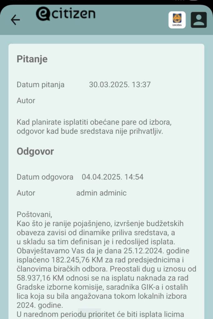 Naime, kako saznajemo iz odgovora koji je na upit anonimnog građanina i po svemu sudeći učesnika u radu GIK-a Gradiška na Lokalnim izborima u oktobru 2024. godine, dostavio gradonačelnik putem eCitizen aplikacije, isplate po osnovu duga za rad GIK-a zavise od dinamike priliva sredstava u Budžet grada.