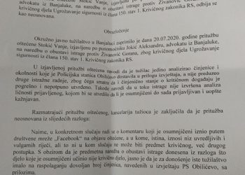 Okružno javno tužilaštvo Banjaluka odbilo je žalbu glavne i odgovorne urednice portala eTrafika Vanje Stokić i time potvrdilo naredbu o...