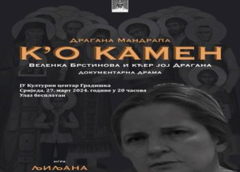 Monodrama "K'o kamen“ autorke Dragane Mandrape, biće odigrana u Kulturnom centru Gradiška u srijedu, 27. marta od 20 časova. U...