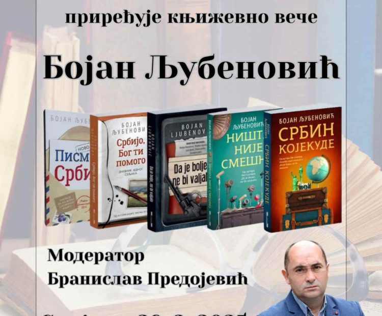 JU “Narodna biblioteka” Gradiška priređuje književno veče sa književnikom Bojanom Ljubenovićem iz Beograda, u srijedu 26.03. 2025. godine u 18 časova u čitaonici Biblioteke. Moderator književne večeri biće Branislav Predojević.