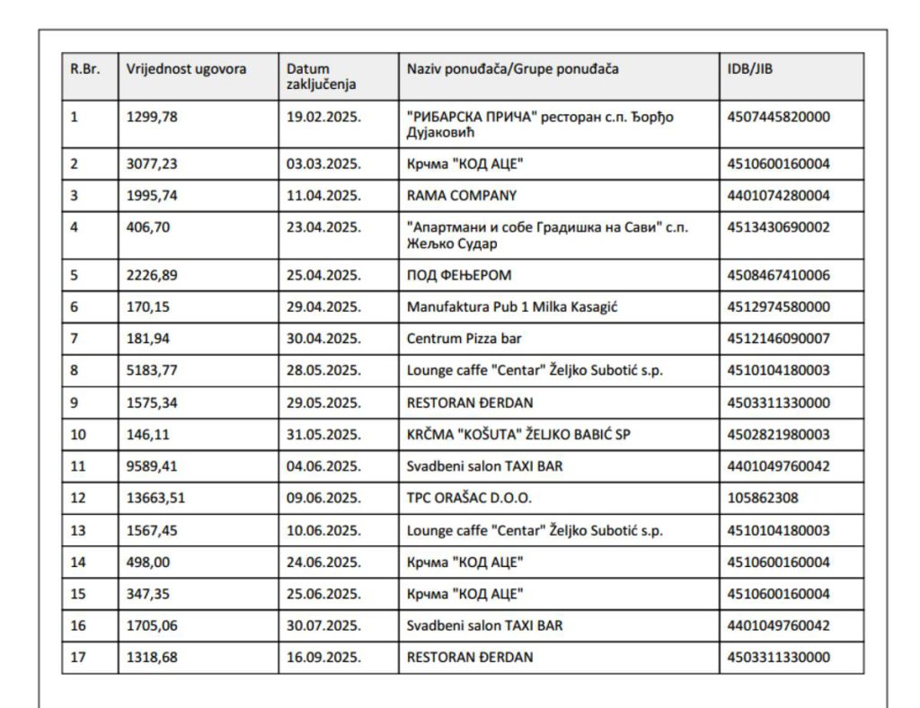 Kako moglo vidjeti, ugovori su zaključivani u periodu od februara do septembra 2025.godine, a usluge su korištene kod najmanje 17 različitih ugostiteljskih i hotelskih objekata počevši od lokalnih restorana i kafana, do svadbenih salona i privrednih društava.