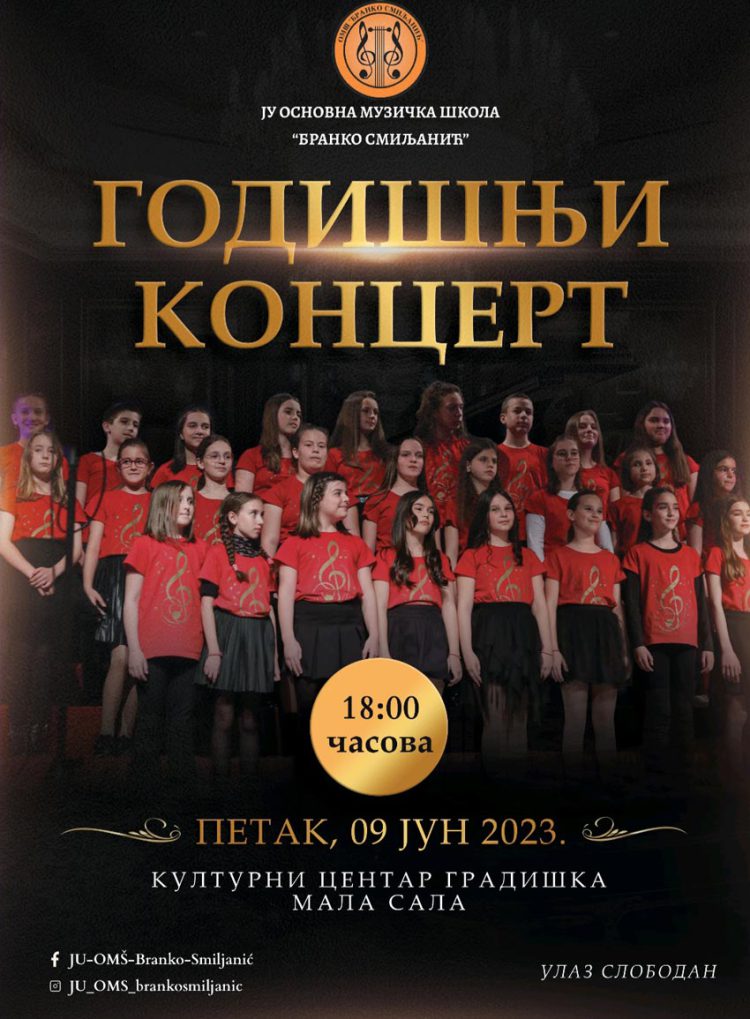 Osnovna muzička škola “Branko Smiljanić” će u petak 09.06.2023. godine sa početkom u 18 časova održati godišnji koncet u Kulturnom centru Gradiška.