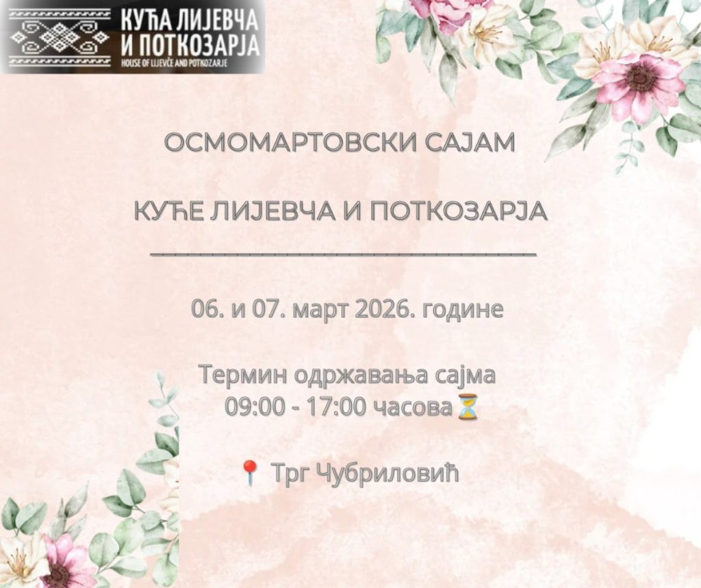 Turistička organizacija grada Gradiška i “Kuća Lijevča i Potkozarja” povodom Međunarodnog dana žena organizuju dvodnevni Osmomartovski sajma od 06. do 07. marta. na Trgu Čubrilovića u Gradišci.