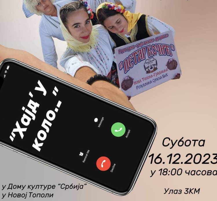 12. godišnji koncert pod nazivom “Hajd’ u kolo” održaće se u subotu 16.12.2023. godine u Novoj Topoli sa početkom u 18 časova.