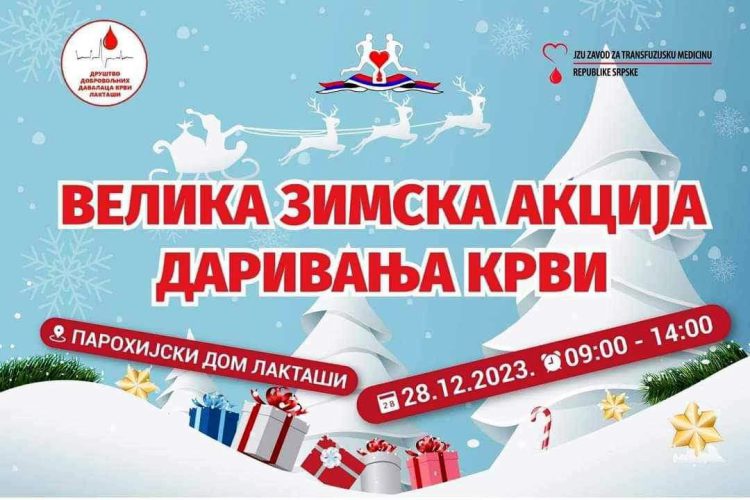 Društvo dobrovoljnih davalaca krvi Laktaši, organizuje akciju dobrovoljnog darivanja krvi koja će se održati u Parohijskom domu u Laktašima, dana 28.12.2023. godine u periodu od 09 – 14.00 časova.