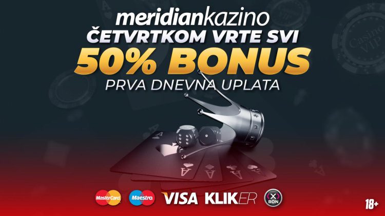 Meridian online kazino ovog četvrtka nudi sjajnu nagradu za tvoj prvi depozit. Četvrtkom vrte svi – zavrti i ti, a tvoja prva dnevna uplata biće bustovana sa 50% bonusa!