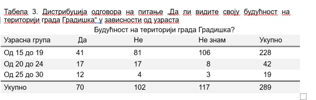 Prema dobijenim rezultatima, samo 24, 2 % ispitanika od ukupno 289 anketiranih, izjasnilo se da vidi svoju budućnost u nastavku življenja na teritoriji grada Gradiška, a takođe njih 71% mladih smatra da su ljudi nezadovoljni uslovima rada i visinom primanja.