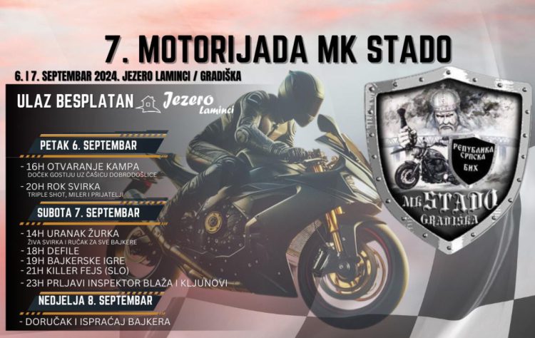 U okviru “Gradiške jeseni”, Moto klub “Stado” organizuje 7. Motorijadu, prvog vikenda u septembru (6. i 7. septembra) koja će se održati na Jezeru Laminci kod Gradiške.