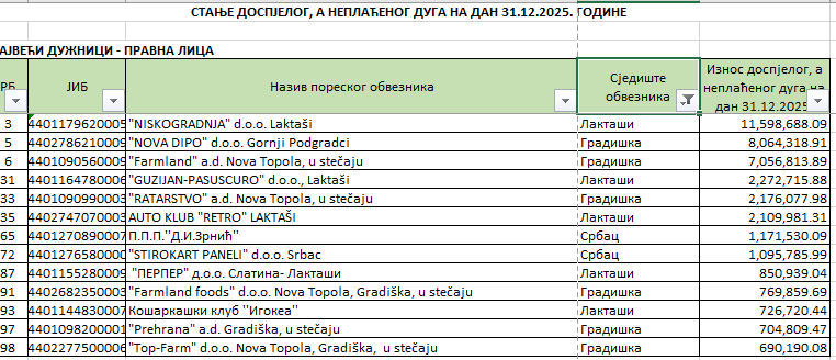 Prema podacima Poreske uprave Republike Srpske zaključno sa 31.12.2025. godine, više od 10 firmi sa područja Gradiške, Srpca i Laktaša našlo se na listi 100 najvećih poreskih dužnika sa ukupnim dugom od oko 48,9 miliona KM.