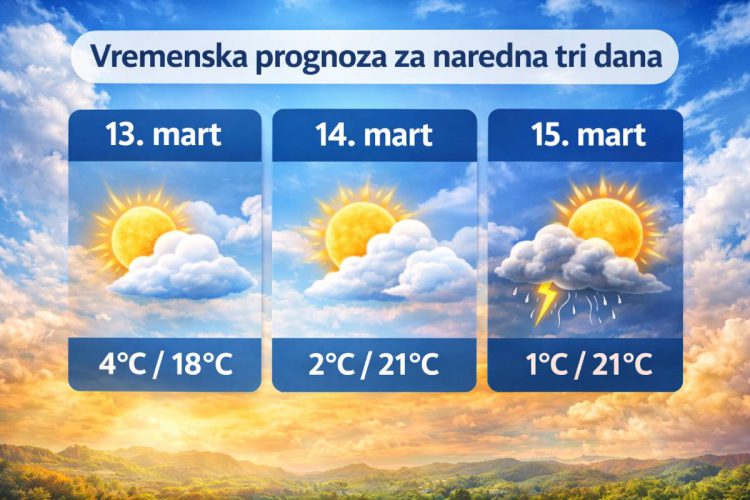 U nedjelju, 15. marta, očekuje se promjenljivo oblačno vrijeme uz povremenu kišu ili kratkotrajne pljuskove praćene grmljavinom. Tokom dana biće i sunčanih intervala, posebno na jugu zemlje, uz temperature koje će biti nešto više od prosjeka za ovo doba godine. Minimalna temperatura vazduha od 1°C do 6°C, a maksimalna temperatura od 15°C do 21°C.
