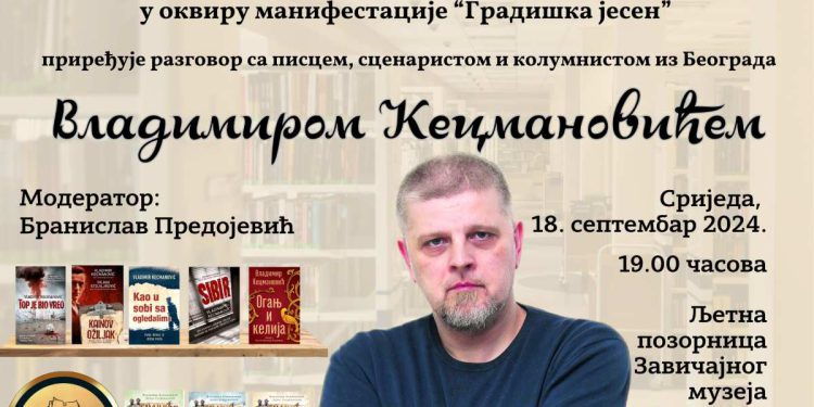 U okviru programa „Gradiška jesen 2024“, književno veče sa piscem, scenaristom i kolumnistom Vladimirom Kecmanovićem biće priređeno na ljetnjoj pozornici Zavičajnog muzeja Gradiška u srijedu, 18. septembra u 19 časova.